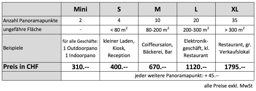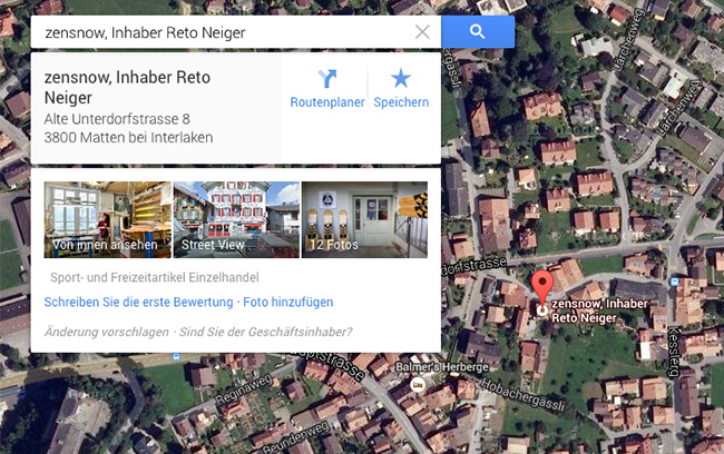 Beim kleinsten Paket sind die 2 Pflichtpanoramen (Outdoor/Indoor) inklusive. Gerne stelle ich Ihnen ein individuelles Angebot für Ihr Geschäft zusammen. Google Maps Business View wird sowohl in der Jungfrau Region wie auch in der ganzen Schweiz angeboten: