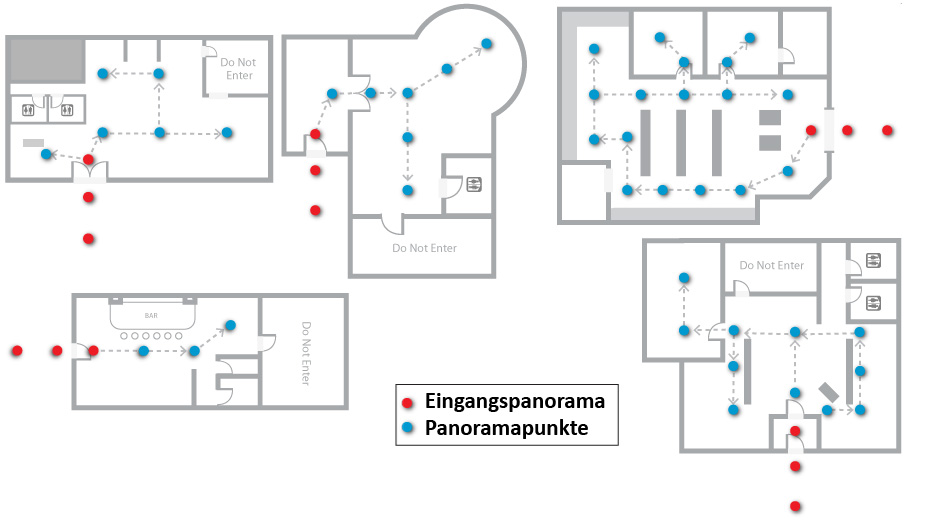 Die ersten drei Panoramen sind empfohlene Eingangspanoramen (rote Punkte). Im Innern folgen im Abstand von 2-5 m weitere Panoramapunkte (blaue Punkte), je nach Grösse Ihres Geschäfts und Anzahl der Räume, die Sie präsentieren möchten. Sie können entscheiden, welche Räumlichkeiten Ihres Geschäfts Sie zeigen wollen. Absolutes Minimum für Google Maps Business View ist ein Outdoor- und ein Indoorpanorama. Die folgende Grafik zeigt verschiedene Grundrisse mit möglichen Standorten der Panoramapunkte.